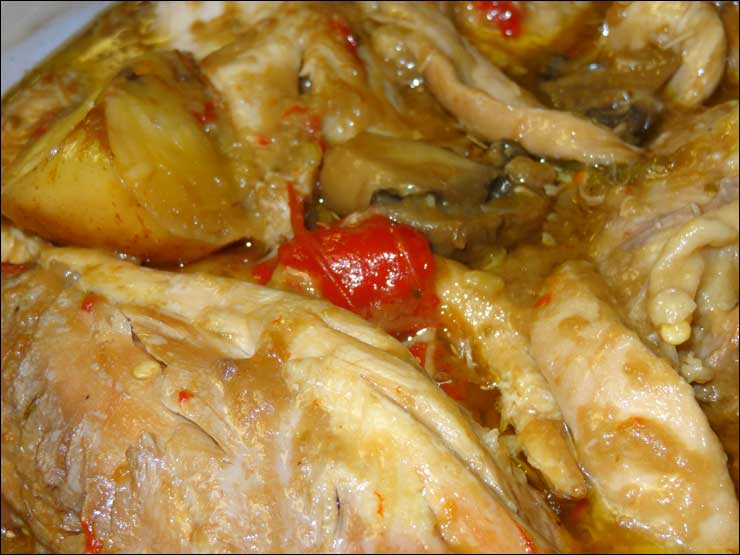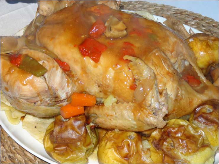 No contento con probar una abundante ración del Capón, por 22 euros, que prepara como nadie en el mundo esta galardonada guisandera gallega, María Teresa Vázquez García, a la que admiro profundamente, tuve la previsión de encargarle, para llevar, otra adicional ración que les nuestro en esta imagen, calentada con mil cuidados al baño maría para mantener intactas todas sus virtudes, acompañada de manzana, champiñones, zanahorias, pimiento verde y rojo y un largo etc. no confesable. Estoy plenamente convencido, aunque es uno de sus muchos secretos, que las Caponeiras que surten a esta cocinera excepcional están en antiguas Lareiras, para que la visión del bucólico paisaje de Terra Chá durante los tres últimos meses de la vida de estos capones Premium, convierte a sus Salaios, gemidos o lamentos por no poder vivir en total libertad, da a sus carnes un sabor y suavidad, personal y especial.