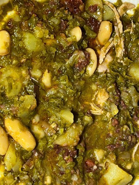 Y todo un descubrimiento para quienes cruzan por primera vez el umbral del local, de suelo de terrazo blanco y negro, bien pulido y abrillantado, con una barra alicatada en tono verde oliva y unas pocas mesas repartidas entre dos salones —con capacidad para una treintena de comensales—, decorados con fotografías que desgranan la historia familiar, recuerdos y plantas hermosas. Un apunte: viendo el cuidado y el mimo con que Maite atiende las macetas, puede adivinarse la pulcritud de su cocina. En ella trabaja, con calma y sin prisa, bajo el mismo techo en el que creció y aprendió a cocinar, de la mano de dos maestras guisanderas a las que venera: su abuela y su madre, que aún sigue enredando cerca.