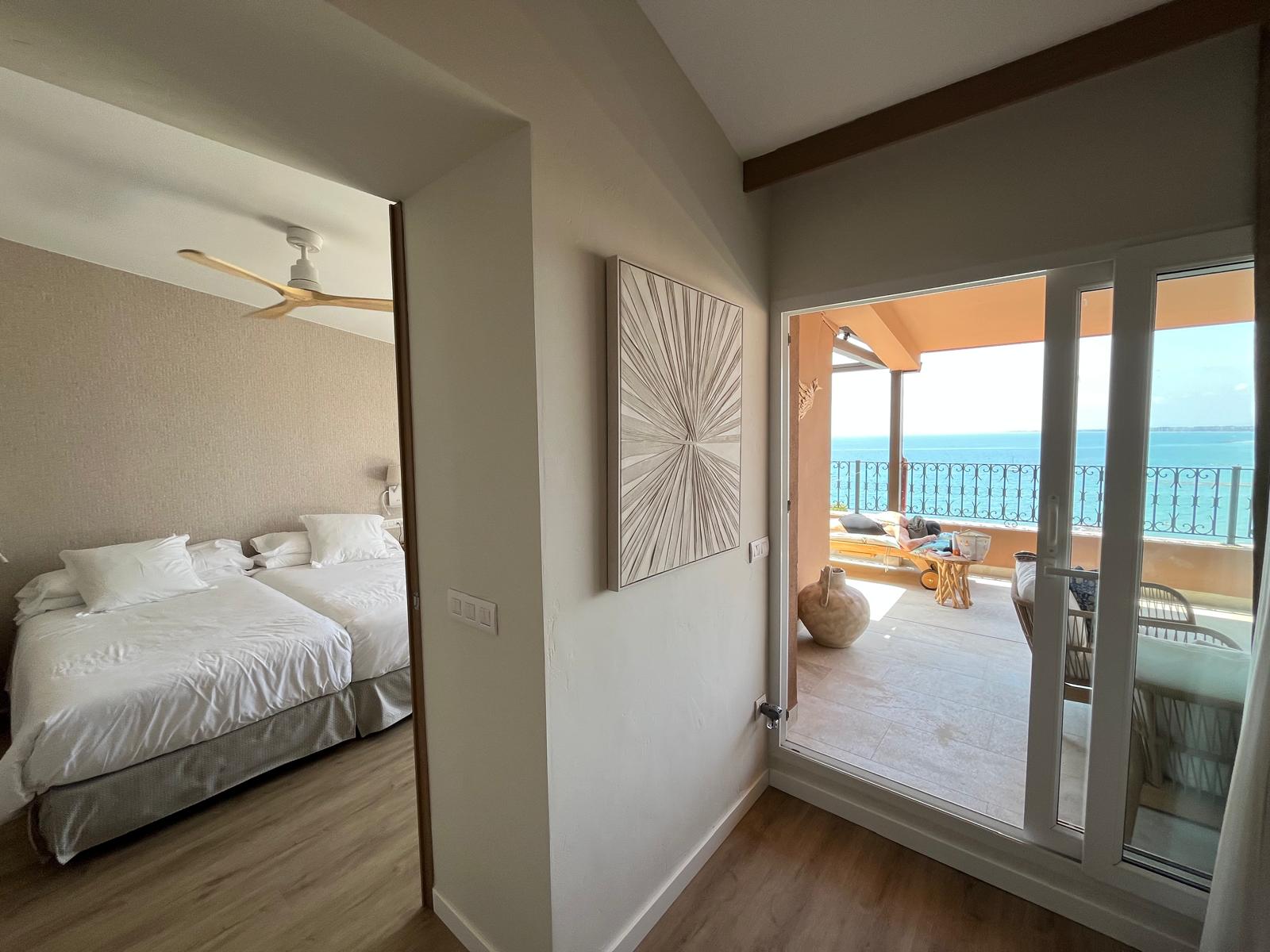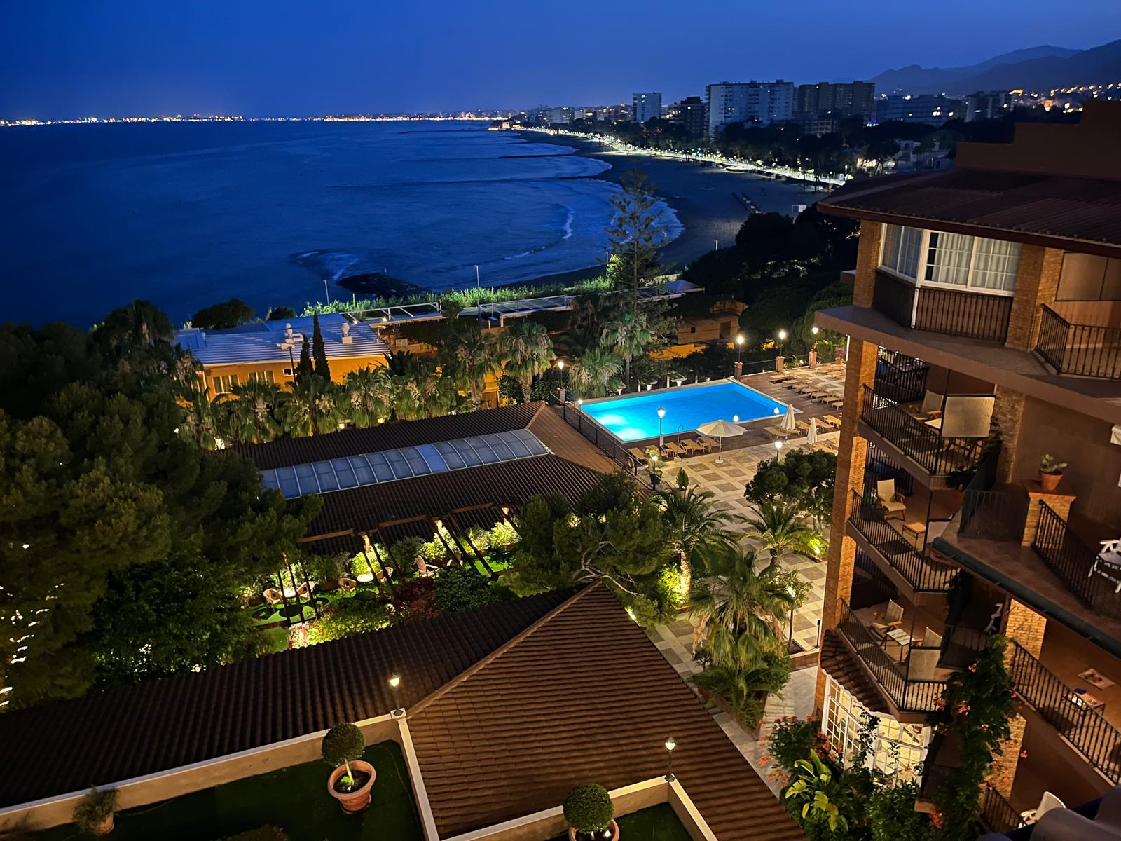 Mi habitación siempre estaba en la quinta planta del hotel La Mola, totalmente pegada al impoluto mar. Con unas tumbonas con sombrilla a 50 metros del hotel, donde unas geishas o camareras, nos servían los aperitivos y el almuerzo a pie de playa y casi en total Soledad.