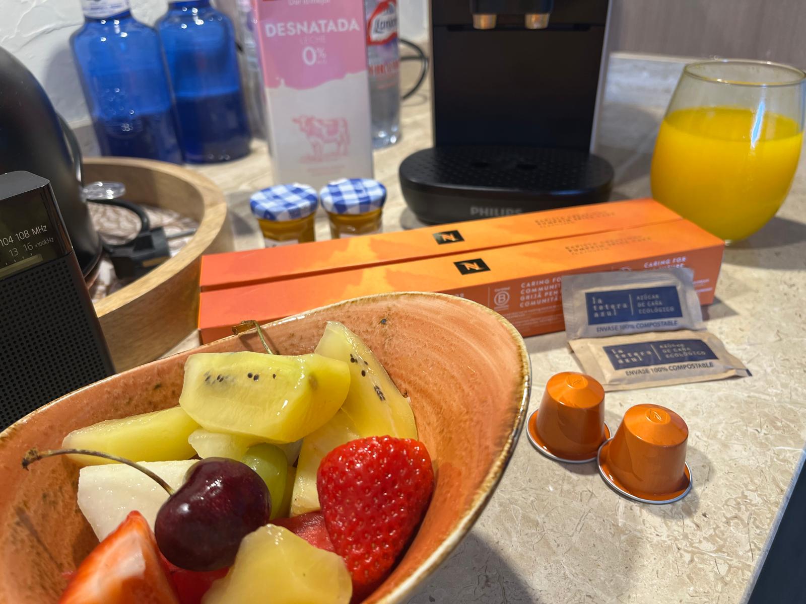 Para disfrutar la pronta llegada del sol veraniego, he desayunado medio litro de naranjas de mesa, muy dulces de Torres, acompañadas de unas torrijas bañadas en crema quemada de Pomme Sucre, + fresas en sazón azucaradas con nata montada de La Playa, con un pedacito de Crenata y de Souflé de fresa, que lo bordan; más un Imperial y unas bizcotelas blancas, de yema, que mojadas en la leche Fresca desnatada con certificado de Bienestar animal que hacen pasteurizada en Galicia para Alcampo.