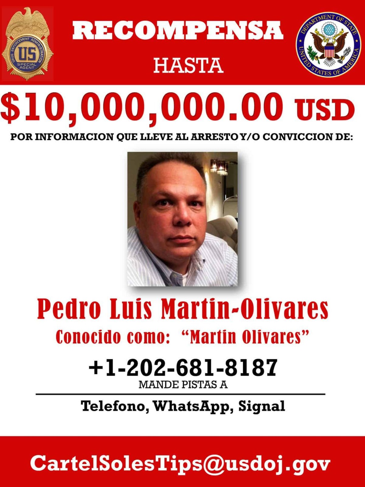 La agencia antidroga estadounidense (DEA) informa en su página que Martín Olivares mide 1,65 cm., pesa unos 113 kg, tiene el pelo marrón y ojos verdes. Para incentivar la colaboración ciudadana, ofrece en estos momentos una recompensa de 10 millones de dólares (8,5 millones de euros) por cualquier “información que lleve al arresto” del investigado.