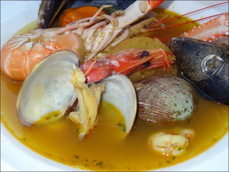 La sopa de pescado, que estaba deliciosa, yo la mejoro siempre limpiando todas las cáscaras y añadiendo pan frito y alioli, que emulsiono con el caldo para transformarlo en una particular bullabesa "de ciego".