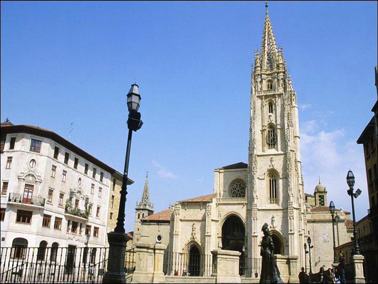 Gracias al rey astur Alfonso II el Casto, se potenció la creación del templo del Apóstol Santiago, una vez que a principios del S. IX se descubriera en Iria Flavia (Padrón) su Santo Sepulcro. Este ferviente creyente y rey Alfonso, peregrinó a visitarlo, creando el Primitivo y Original Camino de Santiago, que se recorre en 18 no muy largas y peatonales etapas, pasando por la también bellísima Catedral de Lugo. Espero que tengáis bien claro dónde y quién inició la Leyenda del Camino de Santiago, desde la Plaza de la Catedral de Oviedo, que es la única de España que tiene una sola torre, joya del gótico flamígero, y un Claustro que corta el aliento, además de la campana Wamba, de 800 kilos, la más antigua del suelo patrio y unas vidrieras guapísimas. Es muy recomendable, antes de visitarla, leer un poco en Internet sobre su riquísima historia, descubriendo sus muchos secretos, como la Reliquia del Santo Sudario, la Cámara Santa, el Panteón de los Reyes, sus Capillas, sus esculturas románicas, el Museo Diocesano, el prodigioso Retablo, las Cruces de Los Ángeles y de La Victoria, sus otras reliquias, tesoros y un etc. que os subyugará.