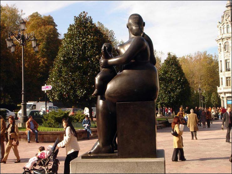 "La Maternidad de Fernando Botero" en la Plaza de la Escandalera de Oviedo con el Parque de San Francisco al fondo y entre el Palacio de la Junta General del Principado y el Operístico Teatro Campoamor, donde se entregan los Premios Príncipe de Asturias.