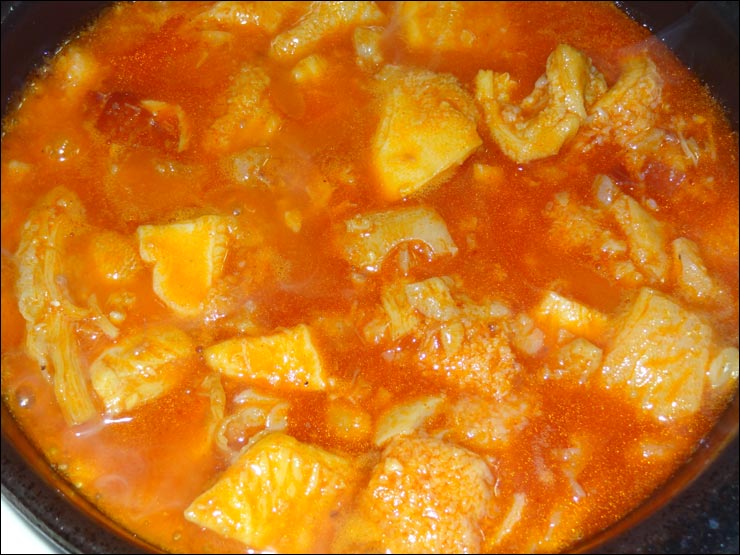 Imagen de uno de los trozos ya emplatado, desde la hirviente cazuela de barro, de la merluza con patatas del restaurante Casa Lito, que había ya tomado hace muchísimos años, cuando era cliente habitual del desgraciadamente desaparecido y buenísimo restaurante Casa Modesta; su merluza a la romana y su fabada eran como muchos otros platos de su carta, de otra galaxia.