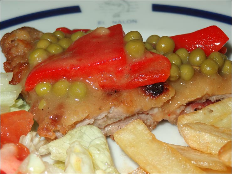 El "Cachopo Nalón" fue el también famoso plato de carne de ternera, rellena de jamón serrano y queso astur, rebozado y acompañado con guisantes en salsa, ensalada y patatas fritas crujientes, que compartimos como hermaniños, por 17 euros. Entre sus clientes famosísimos están los Príncipes de Asturias, Don Camilo José Cela, Don Ángel González, Rafael Alberti, José Hierro, Felipe González, Vargas Llosa y un larguísimo etc. entre los que se encuentran la mayoría de los galardonados en los Premios Príncipe de Asturias y otros famosísimos asistentes a ese internacional y cultural evento.